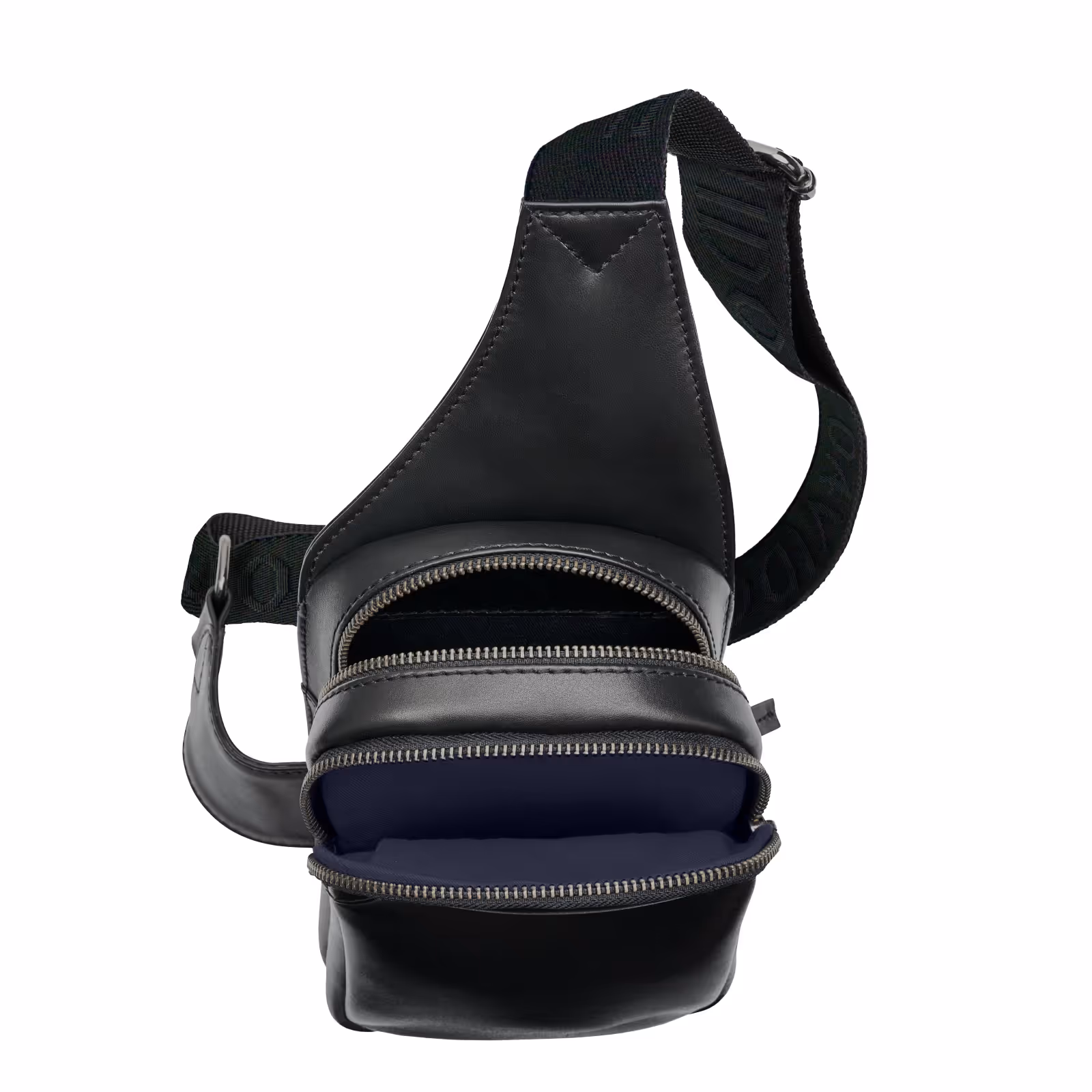 Crafted from smooth black cow leather, this crossbody bag features a modern two-zip design with a compact, structured shape. The front is accented by a zip pocket with an orange leather hyphen-shaped puller embossed with the DAVIDOFF logo, complemented by a discreet embossed logo at the lower right corner. Inside, the blue cotton-lined compartment includes a zipped pocket and a dedicated phone pocket, finished with a silver-printed DAVIDOFF logo and Icon on a centered leather tag. Additional storage comes from a zipped pocket on the back. Gunmetal-plated hardware, black leather hyphen-shaped pullers with contrast stitching, and an adjustable black textile shoulder strap with the DAVIDOFF logo complete this functional yet stylish piece.