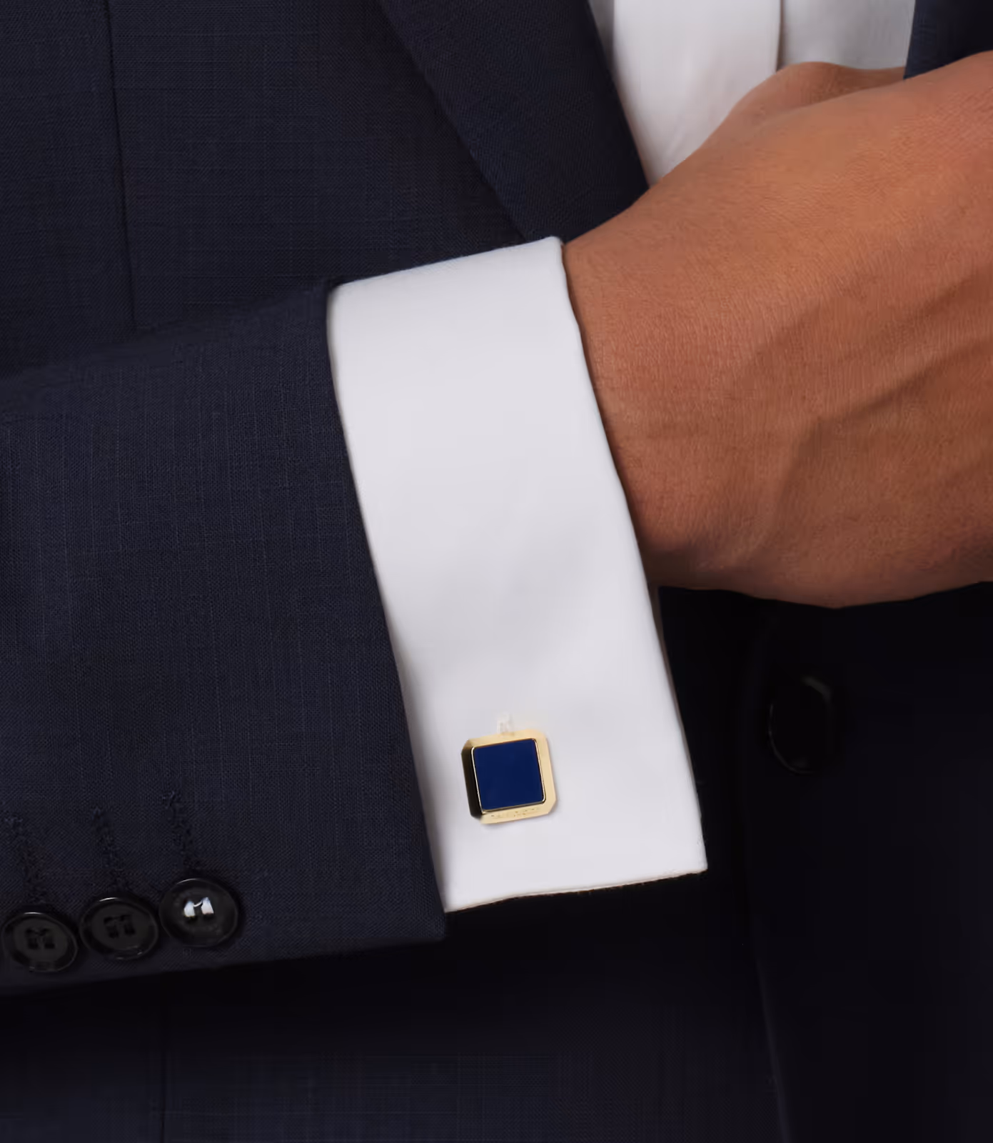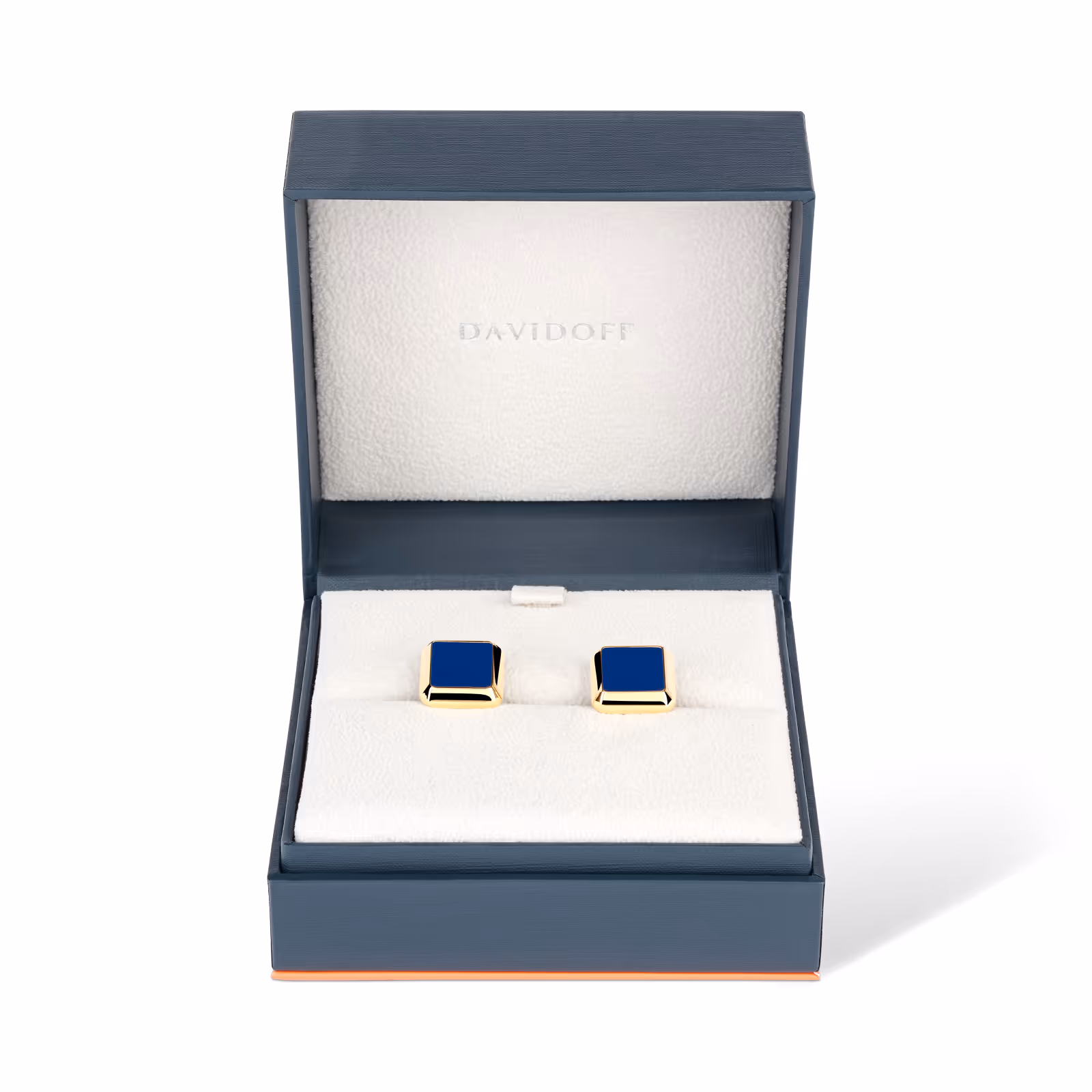 Crafted from brass with a light gold-plated finish, these cufflinks feature an elegant square shape, richly embellished with deep blue lacquer. The faceted frame is engraved with the DAVIDOFF logo, while the whale-back closure bears both the brand’s etched logo and its exclusive hyphen shape. The DAVIDOFF Icon is engraved on the reverse, adding a discreet signature detail. Measuring 16 x 16 x 4 mm, they combine bold design with timeless sophistication.