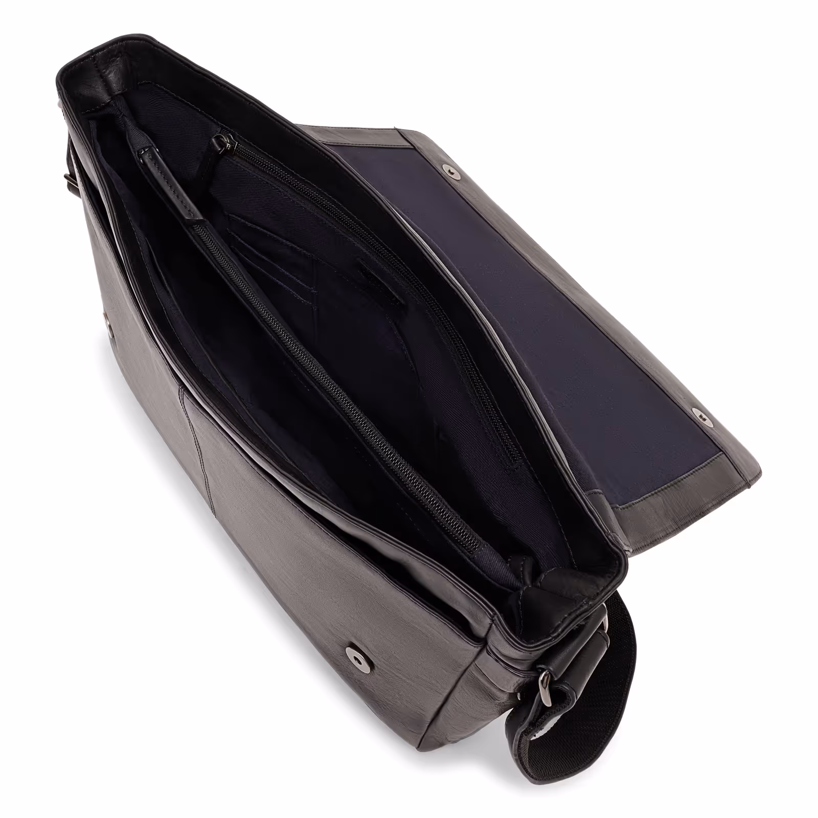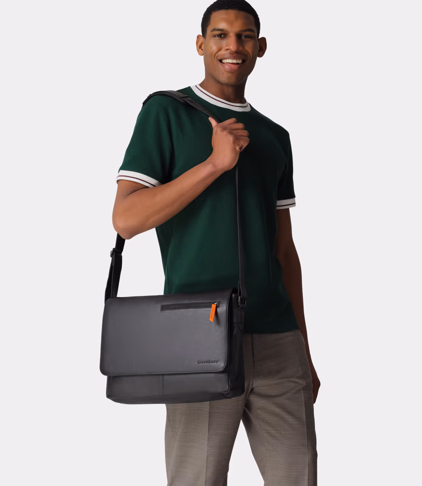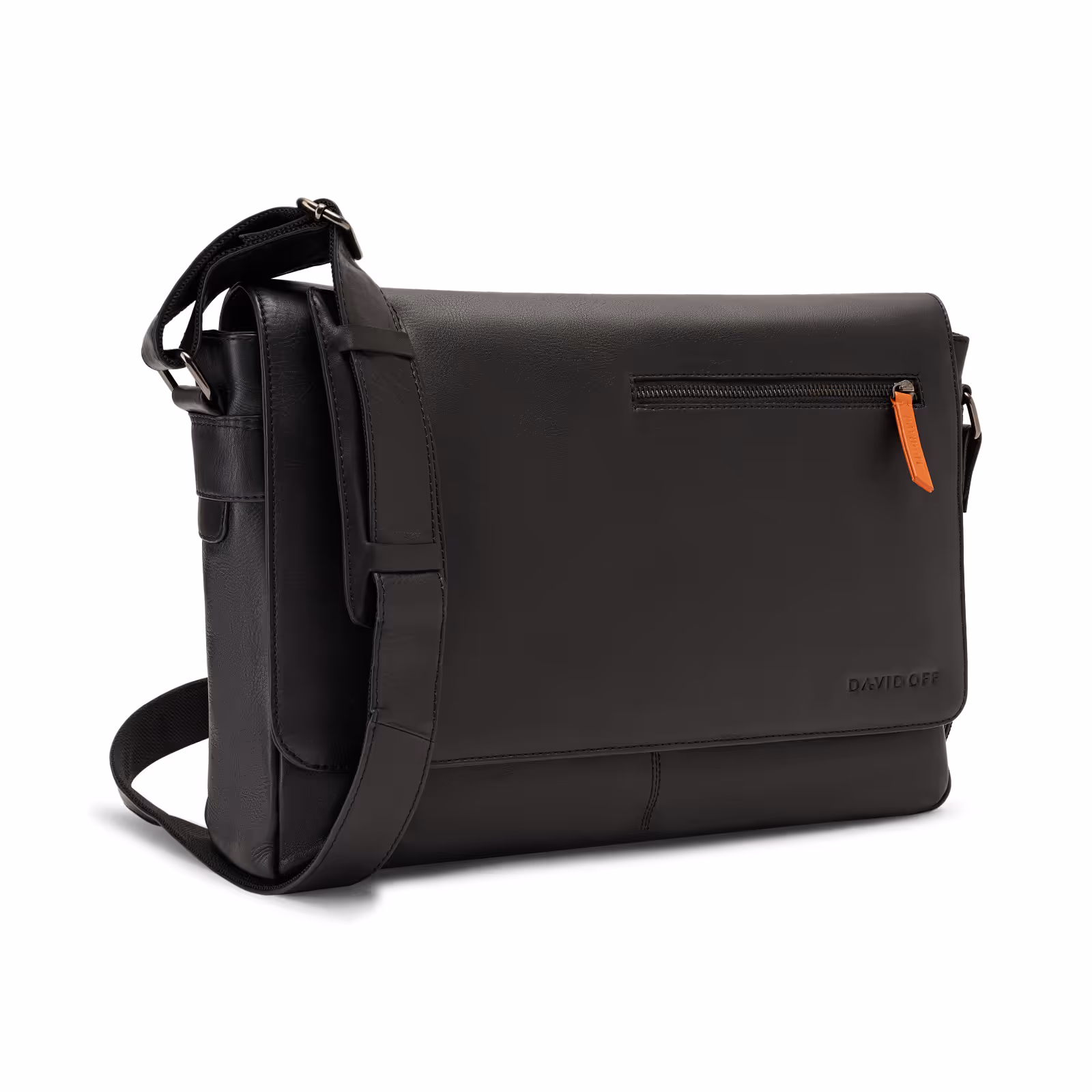 Crafted from soft cow leather, this messenger bag offers a refined blend of style and functionality. The front features a practical zipped pocket with an orange leather puller embossed with the DAVIDOFF logo, lined in contrasting blue cotton, while an embossed logo adds a subtle signature touch. The flap, secured with two hidden magnets, opens to reveal a spacious interior with a large front pocket, two open leather-edged pockets, a zipped divider, and an additional zipped compartment. Thoughtful organization continues with two pen pockets, a phone pocket, and three centered hyphen-shaped card pockets, all set against the signature blue cotton lining. A silver-printed DAVIDOFF logo and Icon adorn a black leather flag inside, while a zipped pocket on the back offers extra storage. Finished with gunmetal-plated hardware, leather zip pullers, and an adjustable black textile strap with tone-on-tone logo and leather shoulder pad, this bag is designed to fit 13–15" laptops and tablets while maintaining a timeless, sophisticated look.