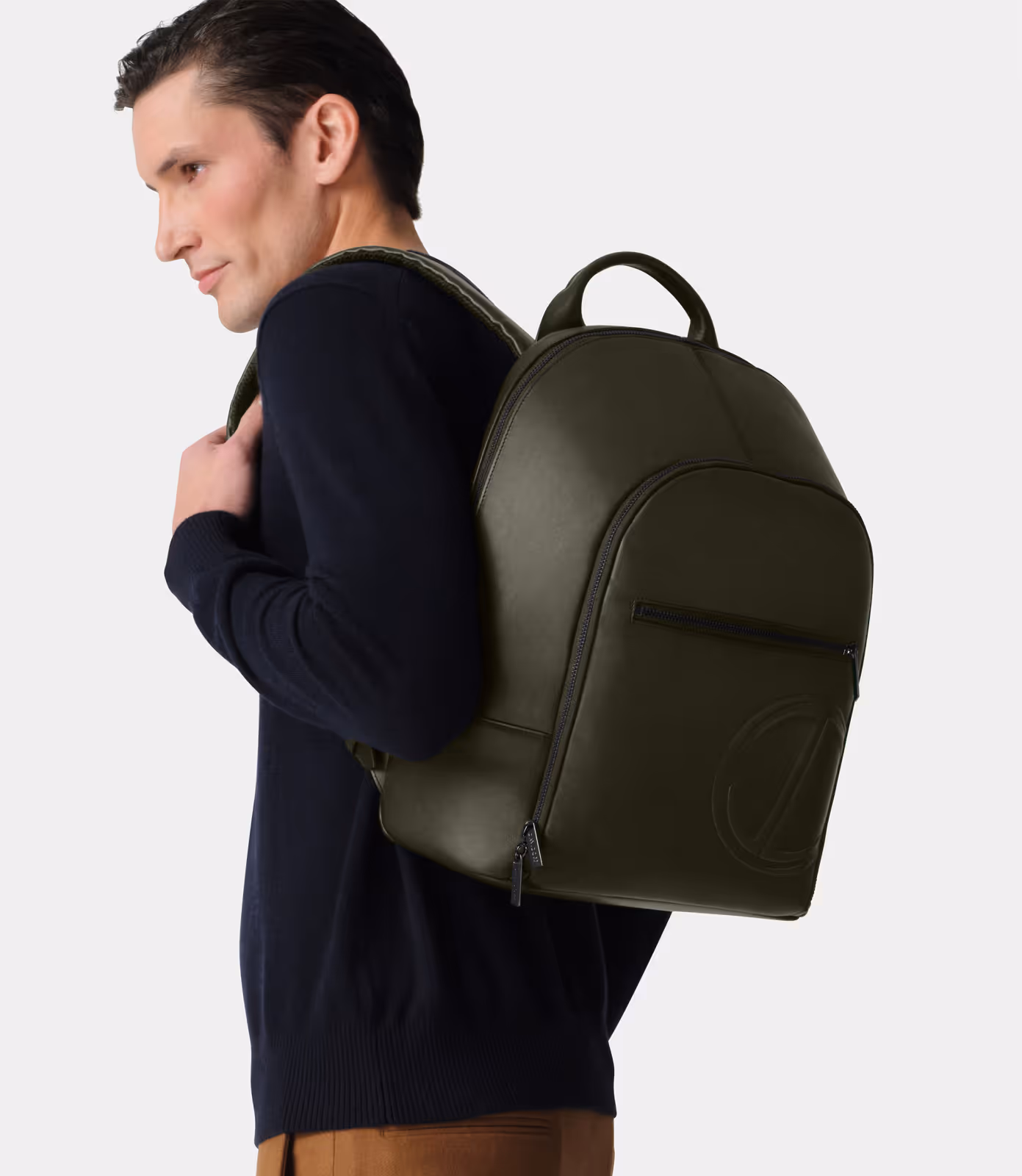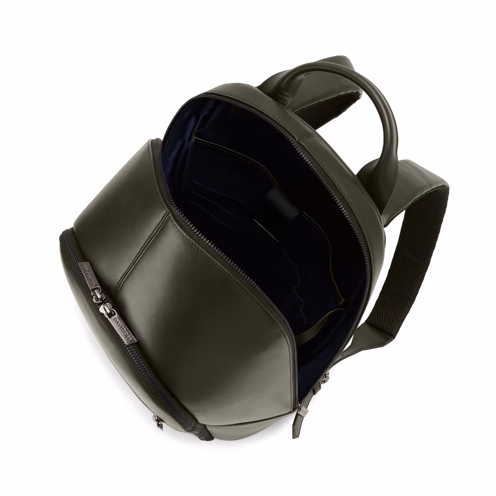 Backpack 2 zip in soft calf leather hand shaded with a constructed structure for a rigid touch. Both zips have double zip pullers in metal with DAVIDOFF logo in hyphen shape. Front side with one zip pocket. Handle in leather. Lining in polycotton blue color. Strap attachments for trolley at the back. DAVIDOFF logo, made in Italy and icon printed in silver on a leather tag centered inside the bag. Icon debossed on the front side at the bottom right side. All metal parts are gun metal color. All zip pullers are in metal gun metal plated with DAVIDOFF logo and hyphen shape. Bag comes with adjustable shourlder straps padded and with mesh on one side. Inside: main compartment with one padded pocket with flap to close with magnets, 3 CCholders, 1 phone pocket and 2 pen pockets in hyphen shape placed centered on the open pocket. In the second zipped pocket there are side gussets for secure opening and one open pocket with leather piping same color as the bag. Bag is entirely made in Italy.